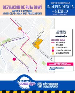 La Secretaría General de Gobierno, a través de la Operadora de Transporte (OTV) informa a la población sobre los desvíos de la ruta troncal del Bowí este 16 de septiembre, para dar paso al desfile conmemorativo por el aniversario del inicio del Movimiento de Independencia de México.
