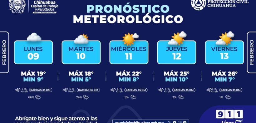 Para el jueves 12 febrero, la temperatura máxima se pronostica sea de 25°C y la mínima de 10°C, con cielo parcialmente nublado y probabilidad de lluvia del 3 por ciento. Finalmente, el viernes 13 febrero, se esperan máximas de 26°C y mínimas de 7°C, condiciones parcialmente nubladas y probabilidad de lluvia del 1 por ciento.