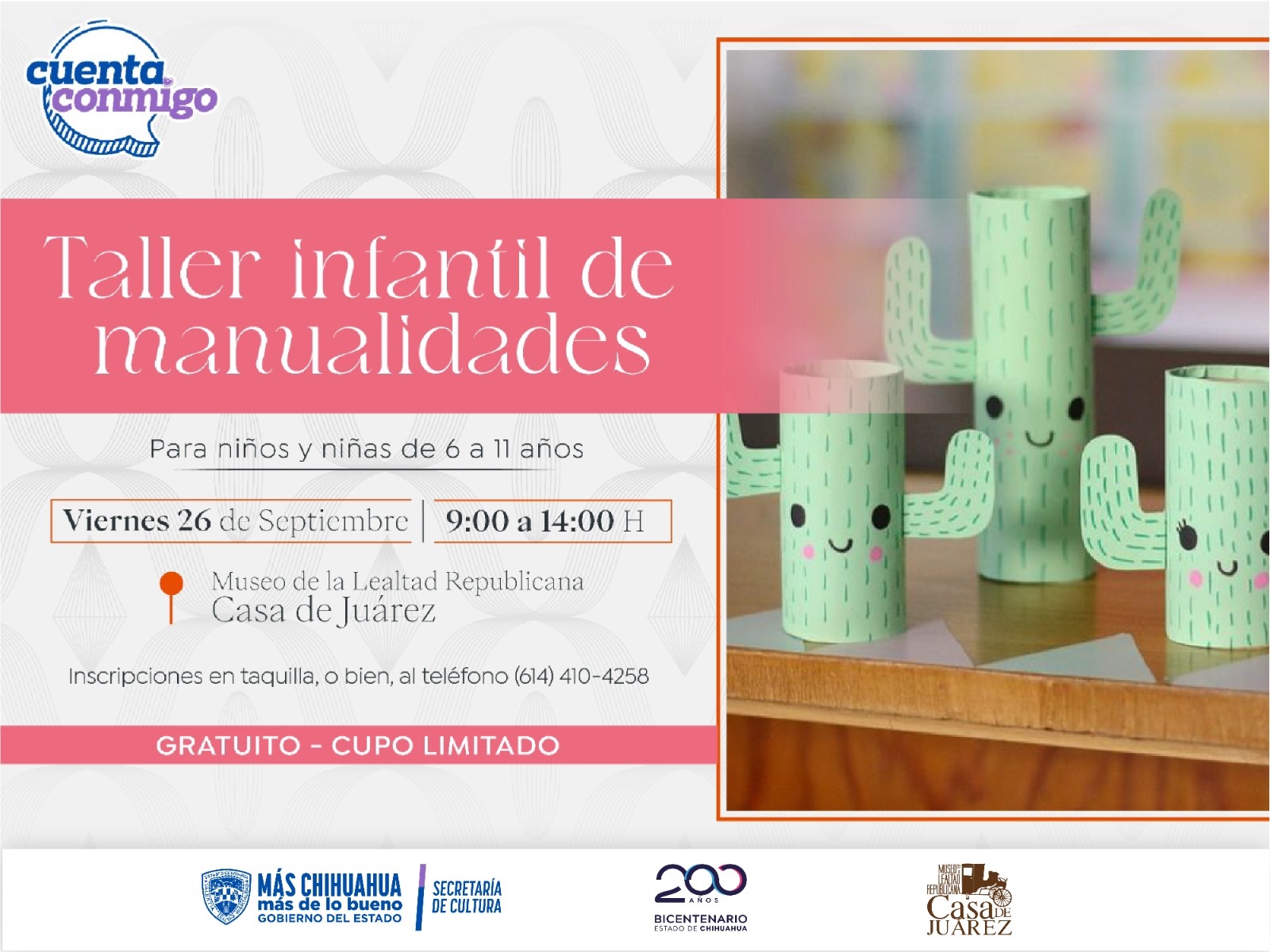 El Gobierno del estado, a través de la Secretaría de Cultura y el Museo de la Lealtad Republicana “Casa de Juárez”, invitan a niños y niñas de 6 a 11 años al Taller Infantil de Manualidades, a efectuarse el viernes 26 de septiembre, de manera gratuita.