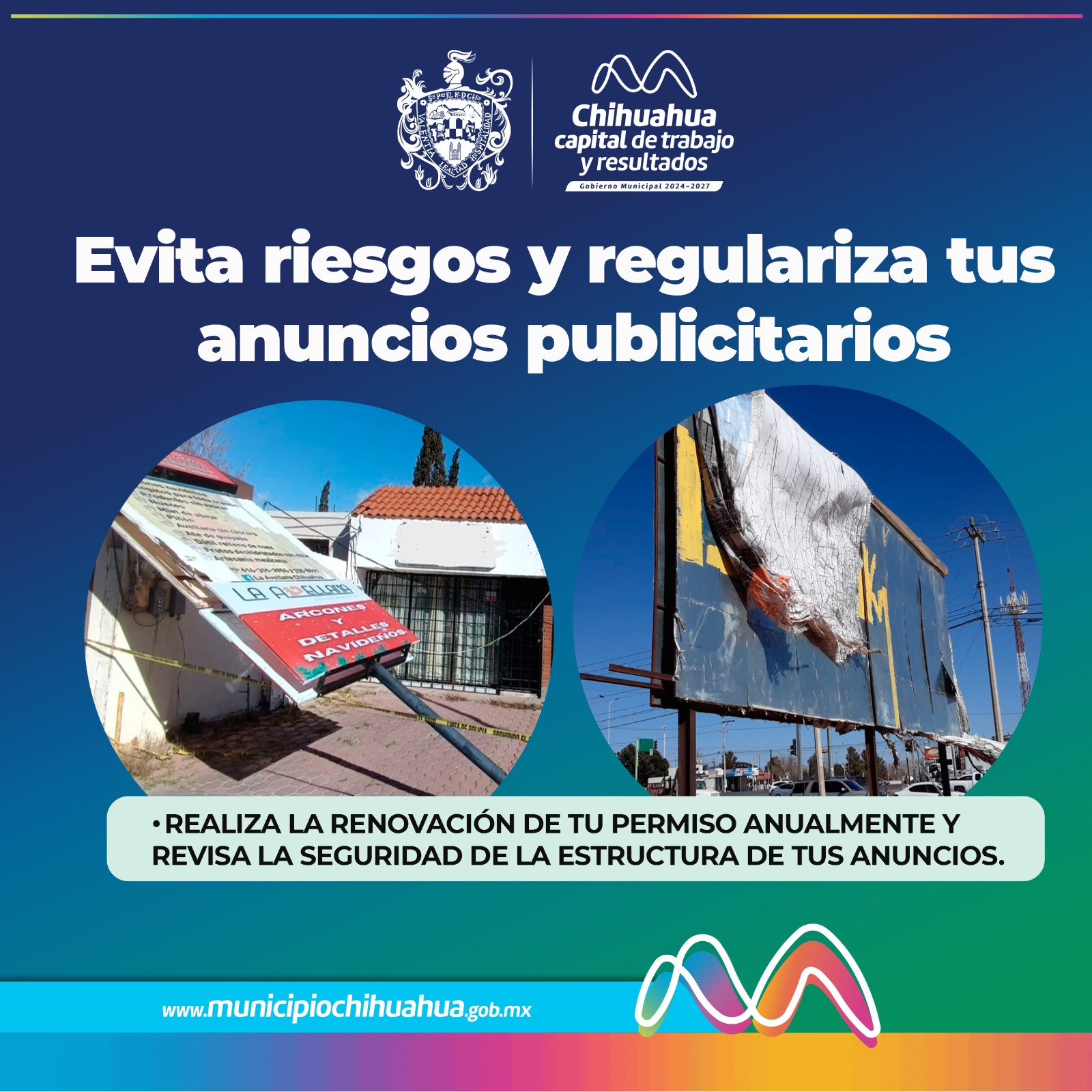Ya que se acerca la temporada de fuertes vientos del año, el Gobierno Municipal, exhorta a regularizar los anuncios publicitarios y seguir las recomendaciones para evitar accidentes que pongar en riesgo la seguridad de las familias.